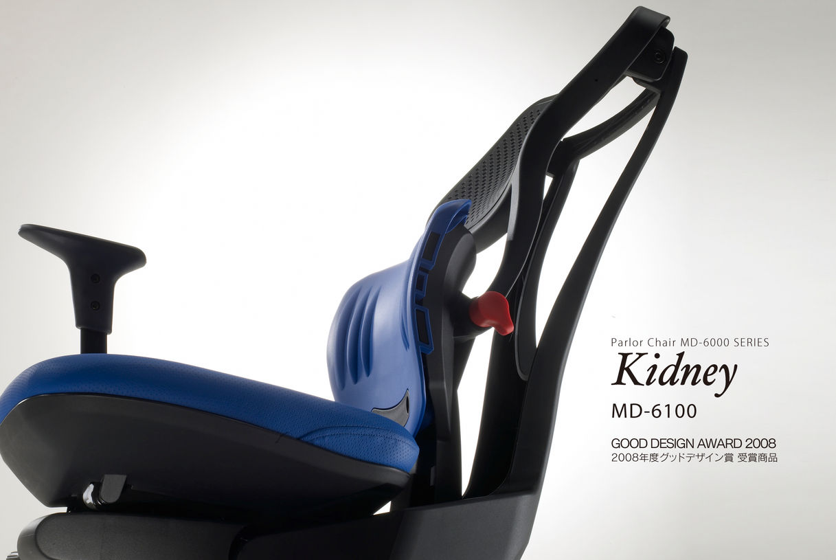 理屈や数値から導き出された「心地よい」とされる椅子も同じ姿勢や同じ動作を持続すると疲労感や苦痛を感じます。このような時私たちは、無意識に座り直したり、姿勢を変更したり動きながら心地よいポジションを求めています。Kidney motionは、背もたれ部を上下二分割して別々に動くようにした背座シンクロロッキング(連動傾斜)機構です。プレイヤーの好みの「楽な姿勢(安息姿勢)」を柔軟かつ優しく支えます。背下部の腰部サポートはレバー操作により固定することができ、背上部は単独でも後傾しますので通路への影響を最小限にしながら大きく背中を反る「背伸びの姿勢」をとることが可能です。長時間遊技での疲労感を軽減するためには快適な座り心地と同時に柔軟なサポート機能や緊張を和らげる動作も大切です。